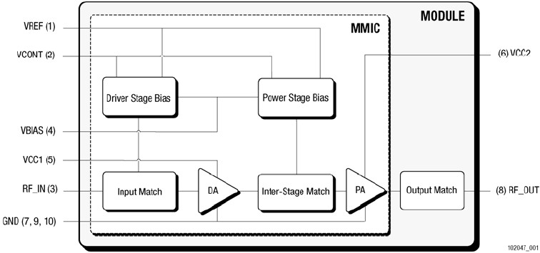 The CX77144 Power Amplifier Module (PAM) is a fully matched, 10-pin surface mount module developed for cellular handset applications utilizing Code Division Multiple Access (CDMA) and Wireless Local Loop (WLL). This small and efficient power amplifier module packs a full 887–925 MHz bandwidth coverage into a single compact package. The device meets the stringent IS95 requirements up 27.5 dBm output power and up to 27 dBm for CDMA2000. A low current digital pin (VCONT) provides improved efficiency for the low RF power range of operation. The single Gallium Arsenide (GaAs) Microwave Monolithic Integrated Circuit (MMIC) contains all active circuitry in the module. The MMIC contains on-board bias circuitry, as well as input and interstage matching circuits. The output match is realized off-chip and within the module package to optimize efficiency and power performance into a 50 Ω load. This device is manufactured with SKYWORKS’ GaAs Heterojunction Bipolar Transistor (HBT) process that provides for all positive voltage DC supply operation while maintaining high efficiency and good linearity. Primary bias to the CX77144 is supplied directly from a three-cell Ni-Cd, a single-cell Li-Ion, or other suitable battery with an output in the range of 3.2 to 4.2 volts. Power down is accomplished by setting the voltage on the low current reference pin to zero volts. No external supply side switch is needed as typical “off” leakage is a few microamperes with full primary voltage supplied from the battery.