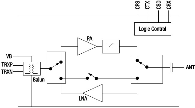 The SE2438T is a high performance, fully integrated Radio Frequency (RF) FEM that is designed for ZigBee®/Smart Energy applications. The SE2438T is designed for ease of use and maximum flexibility, with integrated fully matched input baluns, an integrated inter-stage matching and harmonic filter, and digital controls that are compatible with 1.6 V– 3.6 V Complementary Metal Oxide Semiconductor (CMOS) levels. The RF blocks operate over a wide supply voltage range from 2.0 V to 3.6 V, which allows the SE2438T to be used in battery powered applications over a wide spectrum of the battery discharge curve.