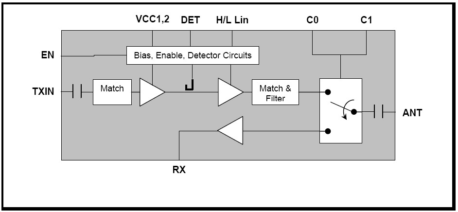The SE5007T is a 5GHz front end module offering high linear power for wireless LAN applications. It incorporates a power detector for control of the output power. The SE5007T offers a high level of integration for a simplified design, providing quicker time to market and higher application board production yield. The device integrates the input match, inter-stage match, a temperature compensated, load insensitive power detector with 20dB of dynamic range, a 3.8GHz notch filter, a T/R switch and LNA. For wireless LAN applications, the device meets the requirements of IEEE802.11a and delivers approximately 17dBm of linear output power. It also features a low linearity mode control to reduce current consumption at low power modes. The SE5007T integrates the reference voltage generator, allowing for a true 1.8V CMOS compatible digital EN (enable) function to turn the power amplifier on and off.