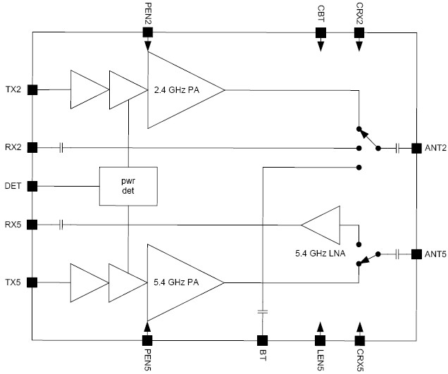 - Integrated 2.4,5 GHz PA, 5 GHz LNA, SP3T, SP2T switches and filtering