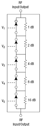 The SKY12329-350LF is a monolithic GaAs, binary-weighted, 5-bit, single positive control voltage digital attenuator which operates from 400 MHz–4 GHz. The attenuator has a least significant bit (LSB) of 1 dB and total attenuation of 31 dB. The two RF ports are bilateral; each can be used as the RF input or the RF output. This attenuator requires an external supply voltage of 2.7–5.5 V. The SKY12329-350LF is comprised of 5 fixed attenuators in cascade, each of which having a shunt bypass switch. Beginning at the LSB, which is 1 dB, each succeeding fixed attenuator produces twice the attenuation of the preceding stage. The state of each bypass switch is controlled by the logic level voltage applied to the associated control voltage input; a logic high voltage closes the associated switch, thereby