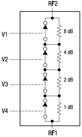 The SKY12348-350LF is a GaAs pHEMT four-bit broadband digital attenuator with a 1 dB Least Significant Bit (LSB). The attenuator features low insertion loss, excellent attenuation accuracy, a 15 dB attenuation range, and high linearity performance. The SKY12348-350LF is an ideal choice for a wide variety of cellular 3G and 4G infrastructure applications. Attenuation is controlled by four DC control pins (V1, V2, V3, and V4). Depending on the control bias, the attenuation state between the RF1 and RF2 pins can vary between a low insertion loss state or up to 15 dB.