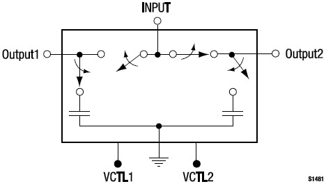 The SKY13351-378LF is a pHEMT GaAs FET I/C switch. The switch may be used in transmit/receive applications by connecting the RF common port (INPUT, pin 5) to either the OUTPUT1 or OUTPUT2 port (pin 1 or 3, respectively) using a low loss path (i.e., a positive voltage applied to either VCTL1 or VCTL2 pins). The switch is “reflective short” on the isolated port. The switch is manufactured in a compact, 1 x 1 mm, 6-pin exposed pad plastic Micro Leadframe Package Dual (MLPD) package.