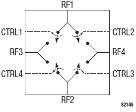 The SKY13353-337LF is a GaAs pHEMT Double-Pole, Double- Throw (DPDT) switch designed for 0.5 to 3.0 GHz diversity WLAN applications that use two antennas for both transmit and receive paths. The device provides high linearity, low insertion loss, and high isolation. Switching is controlled by four control voltage inputs (CTRL1, CTRL2, CTRL3, and CTRL4). Depending on the logic voltage level applied to the control pins, the four RF ports (RF1, RF2, RF3, and RF4) are connected together using a low insertion loss path, while maintaining a high isolation path to the alternate ports. Series DC blocking capacitors are required on all RF ports for proper operation.