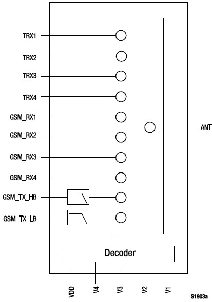 The SKY13364-389LF is a GaAs pHEMT Single Pole, Ten-Throw (SP10T) antenna switch with an integrated CMOS decoder and dual low-pass harmonic filters. The switch has four WCDMA transmit/receive ports, four GSM receive ports, and two GSM transmit ports that make the device ideal for cellular handset and data card applications. Using advance switching technologies, the SKY13364-389LF maintains low insertion loss and high isolation for both transmit and receive switching paths. The switch exhibits an excellent 2nd/3rd order modulation distortion performance.