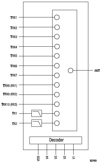 The SKY13412-487LF is a Single Pole, Twelve Throw (SP12T) antenna switch with integrated GSM transmit harmonic filter. The SKY13412-487LF maintains a high linearity, high isolation, and low insertion loss performance, which makes it an ideal choice for UMTS, CDMA2000, EDGE, GSM, and LTE applications. The design features two dedicated GSM transmit ports. The remaining ten ports are suitable for WCDMA transmit/receive and GSM receive functions. Three transmit ports have been specifically designed to provide optimal LTE Band 13 performance. The switch exhibits an excellent triple beat ratio and 2nd/3rd order modulation distortion performance.