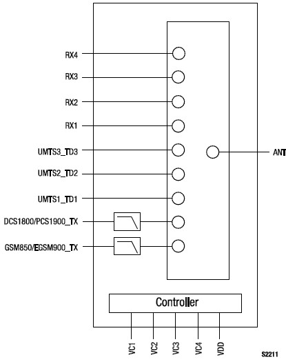 The SKY18120-11 is a Single Pole, Nine-Throw (SP9T) antenna switch Front-End Module (FEM) designed for dual-mode, high power band switching applications that require low harmonics and low insertion loss. The device is optimized for GSM/EDGE, TD-SCDMA, and WCDMA/LTE applications. The SKY18120-11 consists of an SP9T switch, GSM transmit signal low-pass harmonic filters, and a GPIO controller. The low current consumption makes this device very suitable for battery operated applications. The SKY18120-11 is manufactured in a compact, 2.5 x 2.5 mm, 16-pin Multi-Chip Module (MCM) package.