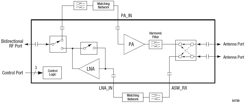 The SKY65346-21 is a high performance transmit/receive (T/R) Front-End Module (FEM) ideally suited for use in 900 MHz Industrial, Scientific, and Medical (ISM) applications. A double-pole, double-throw (DPDT) switch allows the device to select between two antenna ports (ANT1 and ANT2 pins) for the transmit or receive path. A single-pole, double-throw (SPDT) switch selects which signal path is routed to the transceiver port (RFIO pin). The receive path has a Low-Noise Amplifier (LNA) bypass switch.