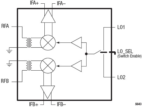 - On-chip SPDT LO switch (greater than 60 dB LO-to-LO isolation)