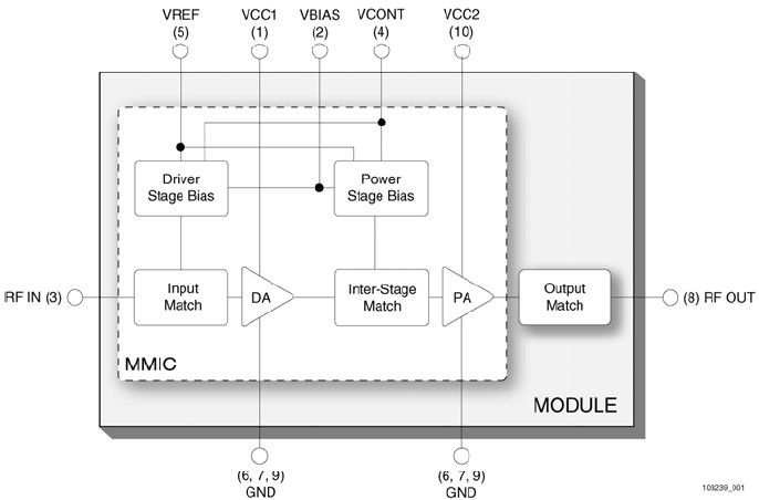 The SKY77161 Power Amplifier Module (PAM) is a fully matched, 10-pin, surface mount module developed for Time Division Synchronous Code Division Multiple Access (TD-SCDMA) applications. SKYWORKS’ SKY77161 also supports TD-SCDMA multi-slot operation. This small and efficient module packs full 2010-2025 MHz bandwidth coverage into a single compact package. The PAM meets the stringent spectral linearity requirements of TD-SCDMA transmission, with high power added efficiency for power output of up to 28 dBm. A low current pin (VCONT) is provided to improve efficiency for the low RF power range of operation. A single Gallium Arsenide (GaAs) Microwave Monolithic Integrated Circuit (MMIC) contains all active circuitry in the module such as on-board bias circuit and input and interstage matching circuits. Output match is realized off-chip within the module package to optimize efficiency and power performance into a 50 Ω load. This device is manufactured with SKYWORKS’ GaAs Heterojunction Bipolar Transistor (HBT) process that provides for all positive voltage DC supply operation while maintaining high efficiency and good linearity. Primary bias to the SKY77161 is supplied directly from a three-cell Ni-Cad, a single cell Li-Ion, or other suitable batteries with outputs in the 3.2 to 4.2 volt range. Power down is accomplished by setting the voltage on the low current reference pin to zero volts. No external supply side switch is needed as typical “off” leakage is a few microamperes with full primary voltage supplied from the battery.