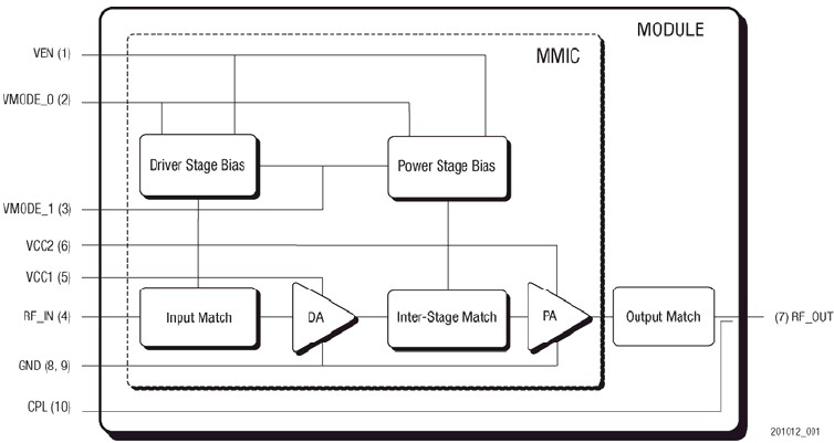 The SKY77188 Power Amplifier Module (PAM) is a fully matched 10-pad surface mount module developed for Wideband Code Division Multiple Access (WCDMA) applications. This small and efficient module packs full 824–849 MHz bandwidth coverage into a single compact package. Because of high efficiencies attained throughout the entire power range, the SKY77188 delivers unsurpassed talk-time advantages. The SKY77188 meets the stringent spectral linearity requirements of High Speed Downlink Packet Access (HSDPA) data transmission with high power added efficiency. A directional coupler is integrated into the module thus eliminating the need for any external coupler. The single Gallium Arsenide (GaAs) Microwave Monolithic Integrated Circuit (MMIC) contains all active circuitry in the module. The MMIC contains on-board bias circuitry, as well as input and interstage matching circuits. Output match into a 50-ohm load is realized off-chip within the module package to optimize efficiency and power performance. The SKY77188 PAM is manufactured with SKYWORKS’ InGaP GaAs Heterojunction Bipolar Transistor (HBT) BiFET process that provides for all positive voltage DC supply operation while maintaining high efficiency and good linearity. Primary bias to the SKY77188 is supplied directly from any three-cell Ni-Cd, a single-cell Li-Ion, or other suitable battery with an output in the 3.2 to 4.2 volt range. No VREF voltage is required. Power down is accomplished by setting the voltage on VENABLE to zero volts. No external supply side switch is needed as typical “off” leakage is a few microamperes with full primary voltage supplied from the battery.