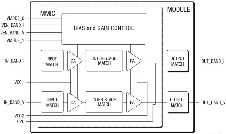 The SKY77197 Power Amplifier Module (PAM) is a fully matched, 14-pad, surface mount module developed for Wideband Code Division Multiple Access (WCDMA) applications. This small and efficient module packs full WCDMA Band I and Band V coverage into a single compact package. The SKY77197 meets the stringent spectral linearity requirements of WCDMA transmission, with high power added efficiency for power output to 28.25 dBm (Band I and Band V). The SKY77197 meets the stringent spectral linearity requirements of High Speed Downlink Packet Access (HSDPA) data transmission with high power added efficiency. A directional coupler is integrated into the module thus eliminating the need for any external coupler. The single Gallium Arsenide (GaAs) Microwave Monolithic Integrated Circuit (MMIC) contains all active circuitry in the module. The MMIC contains on-board bias circuitry, as well as input and interstage matching circuits. Output match into a 50-ohm load is realized off-chip within the module package to optimize efficiency and power performance. The SKY77197 PAM is manufactured with SKYWORKS’ InGaP GaAs Heterojunction Bipolar Transistor (HBT) BiFET process that provides for all positive voltage DC supply operation while maintaining high efficiency and good linearity. No VREF voltage is required. Power down is accomplished by setting the voltage on VENABLE to zero volts. No external supply side switch is needed as typical “off” leakage is a few microamperes with full primary voltage supplied from the battery.
