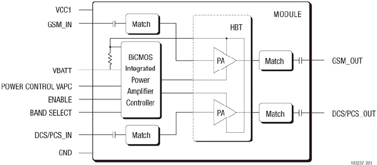 The SKY77328 Power Amplifier Module (PAM) is designed in a low profile (1.2 mm), compact form factor for quad-band cellular handsets comprising GSM850/900, DCS1800, and PCS1900 operation. The PAM also supports Class 12 General Packet Radio Service (GPRS) multi-slot operation. The module consists of separate GSM850/900 PA and DCS1800/PCS1900 PA blocks, impedancematching circuitry for 50 Ω input and output impedances, and a Power Amplifier Control (PAC) block with an internal current-sense resistor. The custom BiCMOS integrated circuit provides the internal PAC function and interface circuitry. Fabricated onto a single Gallium Arsenide (GaAs) die, one Heterojunction Bipolar Transistor (HBT) PA block supports the GSM850/900 bands and the other supports the DCS1800 and PCS1900 bands. Both PA blocks share common power supply pins to distribute current. The GaAs die, the Silicon (Si) die, and the passive components are mounted on a multi-layer laminate substrate. The assembly is encapsulated with plastic overmold. RF input and output ports of the SKY77328 are internally matched to a 50 Ω load to reduce the number of external components for a quad-band design. Extremely low leakage current (2.5 μA, typical) of the dual PA module maximizes handset standby time. The SKY77328 also contains bandselect switching circuitry to select GSM (logic 0) or DCS/PCS (logic 1) as determined from the Band Select (BS) signal. In Figure 1 below, the BS pin selects the PA output (DCS/PCS OUT or GSM850/900 OUT) and the Analog Power Control (VAPC) controls the level of output power. The VBATT pin connects to an internal current-sense resistor and interfaces to an integrated power amplifier control (iPAC™) function, which is insensitive to variations in temperature, power supply, process, and input power. The ENABLE input allows initial turn-on of PAM circuitry to minimize battery drain.