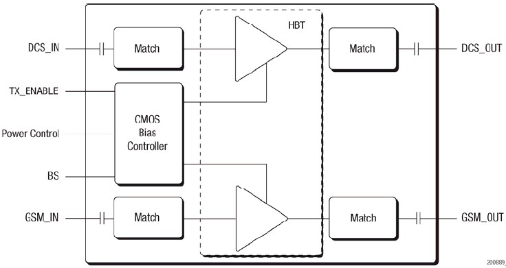 SKY77336 Power Amplifier Module (PAM) is designed in a compact form factor for quad-band cellular handsets comprising GSM850/900, DCS1800 and PCS1900, supporting Gaussian Minimum-Shift Keying (GMSK) and Polar Enhanced Data for GSM Evolution (EDGE) modulation. Class 12 General Packet Radio Service (GPRS) multi-slot operation is also supported. The module consists of GSM850/900 PA and DCS1800/PCS1900 PA blocks, impedance matching circuitry for 50 Ω input and output impedances, and a Power Amplifier Control (PAC) block. The custom CMOS integrated circuit provides the internal PAC function and interface circuitry. Fabricated in InGaP/GaAs, the Heterojunction Bipolar Transistor (HBT) PA blocks support the GSM850/900 bands and DCS1800/PCS1900 bands. Both PA blocks share common power supply pads to distribute current. The InGaP/GaAs die, Silicon (Si) controller die, and passive components are mounted on a multi-layer laminate substrate and the entire assembly is encapsulated with plastic overmold. RF input and output ports of the SKY77336 are internally matched to a 50 Ω load to reduce the number of external components for a quad-band design. Extremely low leakage current (10 μA, typical) of the PAM module maximizes handset standby time. The SKY77336 also contains band-select switching circuitry to select GSM (logic 0) or DCS/PCS (logic 1) as determined from the Band Select (BS) signal. See Figure 1 shown below.