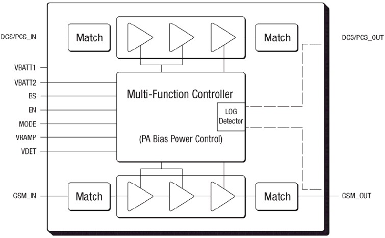 The SKY77344 Power Amplifier Module (PAM) is designed in a compact form factor for quad-band cellular handsets comprising GSM850/900, DCS1800, PCS1900, supporting GMSK and linear EDGE modulation. Class 12 General Packet Radio Service (GPRS) multi-slot operation is also supported. The module consists of a GSM850/900 PA block and a DCS1800/PCS1900 PA block, impedancematching circuitry for 50 Ω input and output impedances, and a Multi-function Power Amplifier Control (MFC) block. A custom BICMOS integrated circuit provides the internal MFC function and interface circuitry. Two separate Heterojunction Bipolar Transistor (HBT) PA blocks are fabricated onto a single InGaP die; one supports the GSM850/900 bands, the other supports the DCS1800 and PCS1900 bands. Both PA blocks share common power supply pads to distribute current. The InGaP die, the silicon die, and the passive components are mounted on a multi-layer laminate substrate. The assembly is encapsulated with plastic overmold. RF input and output ports are internally matched to 50 Ω to reduce the number of external components. Extremely low leakage current (2.5 μA, typical) maximizes handset standby time. Band select (BS) circuitry selects GSM transmit frequency band (logic 0) and DCS/PCS transmit frequency band (logic 1). MODE circuitry selects GMSK modulation (logic 0) or EDGE modulation (logic 1). VRAMP controls the output power for GMSK modulation and provides bias optimization for EDGE modulation depending on the state of MODE control. The integrated multi-function control (MFC) provides closed loop power control in GMSK mode, reducing sensitivity to antenna load, input drive, temperature, power supply, and process variation. In EDGE mode, the MFC configures the PA for fixed gain, and provides the ability to optimize the PA bias operation at different power levels.