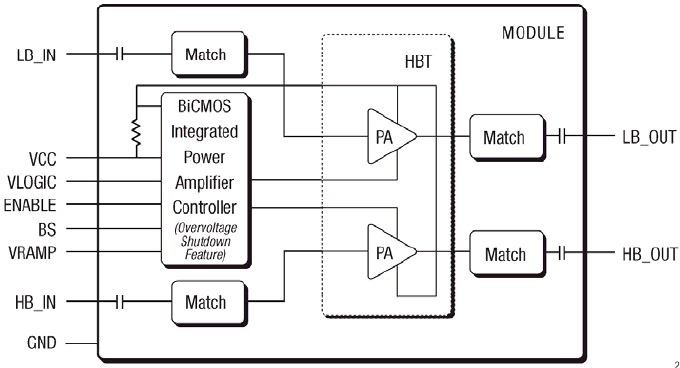 The SKY77346 Power Amplifier Module (PAM) is designed in a low profile (0.9 mm), compact form factor for quad-band cellular handsets comprising GSM850/900, DCS1800, and PCS1900 operation. The PAM also supports Class 12 General Packet Radio Service (GPRS) multi-slot operation. The module consists of separate GSM PA and DCS1800/PCS1900 PA blocks, impedance-matching circuitry for 50 input and output impedances and a Power Amplifier Control (PAC) block with an internal current-sense resistor. The custom BiCMOS integrated circuit provides the internal PAC function and interface circuitry. Fabricated onto a single Gallium Arsenide (GaAs) die, one Heterojunction Bipolar Transistor (HBT) PA block supports the GSM bands and the other supports the DCS1800 and PCS1900 bands. Both PA blocks share common power supply pads to distribute current. The GaAs die, the Silicon (Si) die, and the passive components are mounted on a multi-layer laminate substrate. The assembly is encapsulated with plastic overmold. RF input and output ports of the SKY77346 are internally matched to a 50 load to reduce the number of external components for a quad-band design. Extremely low leakage current (2.5 A, typical) of the dual PA module maximizes handset standby time. The SKY77346 also contains bandselect switching circuitry to select GSM (logic 0) or DCS/PCS (logic 1) as determined from the Band Select (BS) signal. As shown in Figure 1 below, the BS pad selects between the GSM RF input and output pads versus the DCS/PCS RF input and output pads while the Analog Power Control (VRAMP) controls the output power level. The VCC pad connects to an internal current-sense resistor and interfaces to an integrated power amplifier control (iPAC™) function, which is insensitive to variations in temperature, power supply, process, and input power. The BiCMOS controller will shutdown the PA when VCC is raised above the specified operating voltage. The SKY77346 is compatible with logic levels from 1.2 V to VCC for BS and ENABLE pads, depending on the level applied to the VLOGIC pad. This feature provides additional flexibility for the designer in the selection of FEM interface control logic.