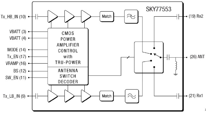 The SKY77351-13 Power Amplifier Module (PAM) is designed in a low profile (0.9 mm), compact form factor for quad-band cellular handsets comprising GSM850/900, DCS1800, and PCS1900 operation. The PAM also supports Class 12 General Packet Radio Service (GPRS) multi-slot operation. The module consists of separate GSM PA and DCS1800/PCS1900 PA blocks, impedance-matching circuitry for 50 input and output impedances and a Power Amplifier Control (PAC) block with an internal current-sense resistor. The custom BiCMOS integrated circuit provides the internal PAC function and interface circuitry. Fabricated onto a single Gallium Arsenide (GaAs) die, one Heterojunction Bipolar Transistor (HBT) PA block supports the GSM bands and the other supports the DCS1800 and PCS1900 bands. Both PA blocks share common power supply pads to distribute current. The GaAs die, the Silicon (Si) die, and the passive components are mounted on a multi-layer laminate substrate. The assembly is encapsulated with plastic overmold. RF input and output ports of the SKY77351-13 are internally matched to a 50 load to reduce the number of external components for a quad-band design. Extremely low leakage current (2.5 A, typical) of the dual PA module maximizes handset standby time. The SKY77351-13 also contains bandselect switching circuitry to select GSM (logic 0) or DCS/PCS (logic 1) as determined from the Band Select (BS) signal. As shown in Figure 1 below, the BS pad selects between the GSM RF input and output pads versus the DCS/PCS RF input and output pads while the Analog Power Control (VRAMP) controls the output power level. The VCC pad connects to an internal current-sense resistor and interfaces to an integrated power amplifier control (iPAC™) function, which is insensitive to variations in temperature, power supply, process, and input power. The BiCMOS controller will shutdown the PA when VCC is raised above the specified operating voltage. The SKY77351-13 is compatible with logic levels from 1.2 V to VCC for BS and ENABLE pads, depending on the level applied to the VLOGIC pad. This feature provides additional flexibility for the designer in the selection of FEM interface control logic.