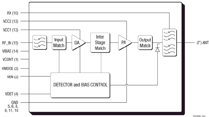The SKY77438 Front-End Module (FEM) is a fully matched, 16-pad surface mount module developed for WCDMA applications. Small and efficient, this WCDMA FEM integrates the interstage filter, the input matching, the power amplifier, the output matching, the power detection, and the duplexer into a single 7 mm x 4 mm x 1.1 mm package. The SKY77438 meets the stringent spectral requirements of WCDMA standards up to 25.0 dBm output power. The FEM incorporates an InGaP HBT PA and contains circuitry to optimize power detector performance. Different control pads are available to enhance the performance of the FEM at different power levels. Integration of the RF front-end greatly simplifies the design of the handset radio as all critical matching between the interstage filter, PA, power detection, and duplexer is optimized within the module. By optimizing the efficiency of the InGaP HBT PA MMIC and reducing the RF loss between the integrated components, this FEM achieves current as low as 525 mA at maximum output power (25.0 dBm) that significantly improves the talk time of the WCDMA handset. This small package uses SKYWORKS’ low cost, multi-laminate substrate technology and is approximately half the size of individually-packaged component solutions. The SKY77438 front-end module can save handset designers significant board space and design-cycle time.