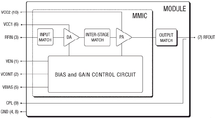 The SKY77448 Load-Insensitive Power Amplifier (LIPA®) module is a fully matched 10-pad surface mount module developed for Wideband Code Division Multiple Access (WCDMA) applications. This small and efficient module packs full 824–849 MHz bandwidth coverage into a single compact package. Because of high efficiencies attained throughout the entire power range, the SKY77448 delivers unsurpassed talk-time advantages. The SKY77448 meets the stringent spectral linearity requirements of High Speed Downlink Packet Access (HSDPA) data transmission with high power added efficiency. A directional coupler integrated into the module eliminates the need for any external coupler. The single Gallium Arsenide (GaAs) Microwave Monolithic Integrated Circuit (MMIC) contains all active circuitry in the module. The MMIC contains on-board bias circuitry, as well as input and interstage matching circuits. Output match into a 50-ohm load is realized off-chip within the module package to optimize efficiency and power performance. The SKY77448 operates as a load-insensitive power amplifier providing high linearity in the presence of high RF mismatch up to 3:1 VSWR. The module is manufactured with SKYWORKS’ InGaP GaAs Heterojunction Bipolar Transistor (HBT) BiFET process that provides for all positive voltage DC supply operation while maintaining high efficiency and good linearity. No VREF voltage is required. Power down is accomplished by setting the voltage on VEN to zero volts. No external supply side switch is needed as typical “off” leakage is a few microamperes with full primary voltage supplied from the battery.