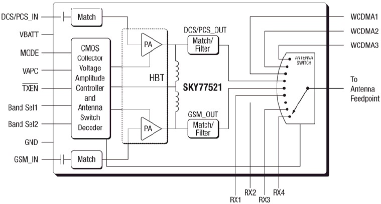 SKY77521 is a transmit and receive Front End Module (FEM) designed in a very low profile (1 mm), compact form factor for quad-band cellular handsets comprising GSM850/900, DCS1800, and PCS1900 operation — a complete transmit VCO-to-Antenna and Antenna-toreceive SAW filter solution. The FEM also supports Class 12 General Packet Radio Service (GPRS) multi-slot operation and EDGE Polar Modulation. WCDMA switch-through support is provided by three dedicated high-linearity ports. The module consists of a GSM850/900 PA and DCS1800/PCS1900 PA block, impedancematching circuitry for 50 Ω input and output impedances, TX harmonic filtering, high linearitylow insertion loss switches, and a CMOS Power Amplifier Control (PAC) block. A custom silicon integrated circuit contains decoder circuitry to control the RF switch while providing a low current external control interface. Fabricated in InGaP/GaAs, the Heterojunction Bipolar Transistor (HBT) PA blocks support the GSM850/900 bands and DCS1800/PCS1900 bands. Both PA blocks share common power supply pads to distribute current. The output of the PA block and the outputs to the seven receive pads connect to the antenna pad through a highly linear antenna switch. The InGaP/GaAs die, switch die, Silicon (Si) controller die, and passive components are mounted on a multi-layer laminate substrate and the entire assembly is encapsulated with plastic overmold.