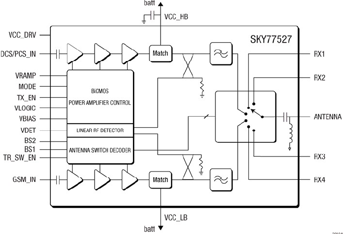 The SKY77527-21 Tx Front End Module (FEM) is designed in a compact form factor for quad-band cellular handsets comprising GSM850/900, DCS1800, PCS1900, supporting GMSK and linear EDGE modulation. Class 12 General Packet Radio Service (GPRS) multi-slot operation is also supported. The module consists of a GSM850/900 PA block and a DCS1800/PCS1900 PA block, impedancematching circuitry for 50 Ω input and output impedances, a multifunction power amplifier control (MFC) block, low pass harmonic rejection filters, and an SP6T Antenna T/R switch. Two separate Heterojunction Bipolar Transistor (HBT) PA blocks are fabricated onto an InGaP die; one supports the GSM850/900 bands, the other supports the DCS1800/PCS1900 bands. The InGaP PA die, the silicon MFC die, PHEMT switch die, and the passive components are mounted on a multi-layer laminate substrate. The assembly is encapsulated with plastic overmold. Band select (BS1 and BS2) circuitry is used to select the desired Tx and Rx frequency bands; MODE circuitry selects GMSK modulation (logic 0) or EDGE modulation (logic 1); VRAMP controls the output power for GMSK modulation; and VBIAS provides bias optimization for EDGE and GMSK modulation depending on the state of MODE control. The Multi-function Control (MFC) provides “pinout” for interoperation with an external power control loop. The external circuit uses the Linear Detector output to provide closed loop power control in both EDGE and GMSK modes of operation. The power control loop together with the MFC will reduce sensitivity to antenna load, input drive, temperature, power supply, and process variation. The combined circuit configures the PA for fixed gain in 8PSK mode while providing the ability to optimize the PA bias at different power levels to maximize efficiency.