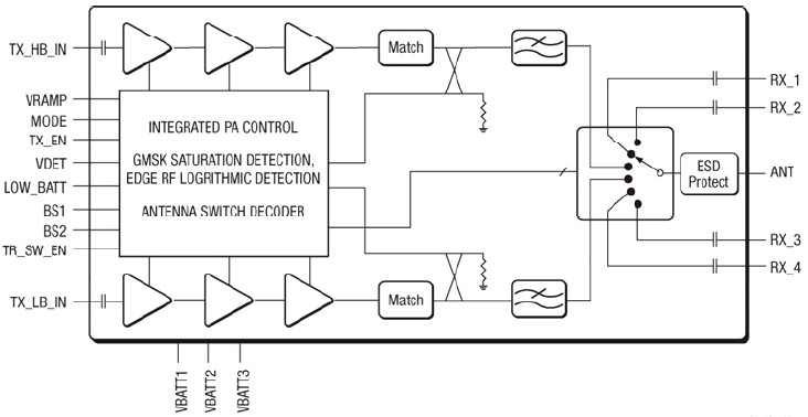 The SKY77528 is a transmit Front-End Module (FEM) designed for quad-band Global System for Mobile Communications (GSM), General Packet Radio Service (GPRS), and Enhanced Data Rate for GSM Evolution (EDGE) handsets and modules. The SKY77528 consists of a GSM850/EGSM900 PA block and a DCS1800/PCS1900 PA block, impedance-matching circuitry for 50 Ω inputs and outputs, a multi-function PA control block, lowpass harmonic rejection filter, and a transmit/receive antenna switch. Two Heterojunction Bipolar Transistor (HBT) PA blocks are fabricated onto an Indium Gallium Phosphide (InGaP) die; one block supports the GSM850 and EGSM900 bands, the other supports the DCS1800 and PCS1900 bands. The InGaP die, the Silicon (Si) die, the PHEMT die, and the passive components are mounted on a multi-layer laminate substrate. The entire assembly is encapsulated with plastic overmold. Pad signals BS1 and BS2 select the GSM/EGSM or DCS/PCS frequency bands. The TX_EN pad signal selects transmit or receive mode of the respective RF switch. MODE pad circuitry selects GMSK modulation or EDGE modulation. The VRAMP pad controls the output power for GMSK modulation and provides bias optimization for EDGE modulation depending on the state of the MODE pad. An integrated Multi-Function Control (MFC) circuit provides closed loop power control in GMSK mode, reducing sensitivity to antenna load, input drive, temperature, power supply, and process variation. In EDGE mode, the MFC configures the PA for fixed gain and provides the ability to optimize the PA bias operation at different power levels. The VDET pad is used to detect saturation conditions in GMSK mode (which automatically reduces the VRAMP output) and for power control in EDGE mode.