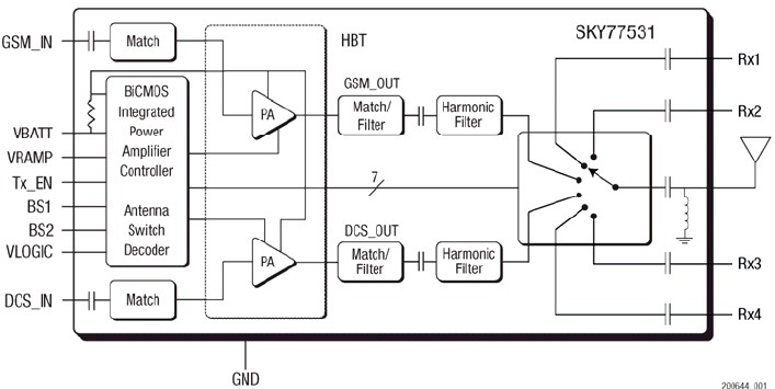 The SKY77531 is a transmit and receive front-end module (FEM) with Integrated Power Amplifier Control (iPAC™) for quad-band cellular handsets comprising GSM850/900 and DCS1800/PCS1900 operation. Designed in a low profile, compact form factor, the SKY77531 offers a complete Transmit VCO-to-Antenna and Antenna-to-Receive SAW filter solution. The FEM also supports Class 12 General Packet Radio Service (GPRS) multi-slot operation. The module consists of a GSM850/900 PA block and a DCS1800/PCS1900 PA block, impedancematching circuitry for 50 Ω input and output impedances, TX harmonics filtering, high linearity and a low insertion loss PHEMT RF switch, and a Power Amplifier Control (PAC) block with internal current sense resistor. A custom BiCMOS integrated circuit provides the internal PAC function and decoder circuitry to control the RF switches. The two Heterojunction Bipolar Transistor (HBT) PA blocks are fabricated onto a single Gallium Arsenide (GaAs) die. One PA block supports the GSM850/900 band and the other PA block supports the DCS1800/PCS1900 band. Both PA blocks share common power supply pads to distribute current. The output of each PA block and the outputs to the two receive pads are connected to the antenna pad through a PHEMT RF switch. The GaAs die, PHEMT die, Silicon (Si) die and passive components are mounted on a multi-layer laminate substrate. The assembly is encapsulated with plastic overmold.