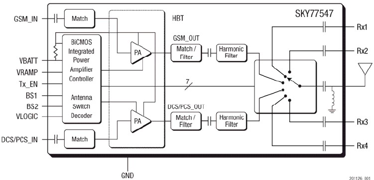 The SKY77547 is a transmit and receive front-end module (FEM) with Integrated Power Amplifier Control (iPAC™) for dual-band cellular handsets comprising 850 and PCS1900 operation. Designed in a low profile, compact form factor, the SKY77547 offers a complete Transmit VCO-to-Antenna and Antenna-to-Receive SAW filter solution. The FEM also supports Class 12 General Packet Radio Service (GPRS) multi-slot operation. The module consists of a GSM850 PA block and a PCS1900 PA block, impedance-matching circuitry for 50 Ω input and output impedances, Tx harmonics filtering, high linearity and low insertion loss PHEMT RF switches, diplexer and a Power Amplifier Control (PAC) block with internal current sense resistor. A custom BiCMOS integrated circuit provides the internal PAC function and decoder circuitry to control the RF switches. The two Heterojunction Bipolar Transistor (HBT) PA blocks are fabricated onto a single Gallium Arsenide (GaAs) die. One PA block supports the GSM850 band and the other PA block supports the PCS1900 band. Both PA blocks share common power supply pads to distribute current. The output of each PA block and the outputs to the two receive pads are connected to the antenna pad through PHEMT RF switches and a diplexer. The GaAs die, PHEMT die, Silicon (Si) die and passive components are mounted on a multi-layer laminate substrate. The assembly is encapsulated with plastic overmold.