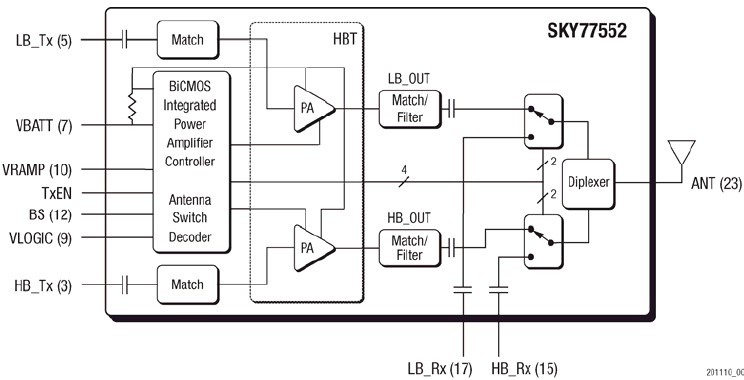 The SKY77552 is a quad-band transmit and dual-band receive front-end module (FEM) with Integrated Power Amplifier Control (iPAC™) for cellular handsets comprising GSM and DCS/PCS operation. The FEM has quad-band capability in applications of U.S. or Euro dual-band platforms. Designed in a low profile, compact form factor, the SKY77552 offers a complete Transmit VCO-to- Antenna and Antenna-to-Receive SAW filter solution. The FEM also supports Class 12 General Packet Radio Service (GPRS) multi-slot operation. The module consists of a GSM PA block and a DCS/PCS PA block, impedance-matching circuitry for 50 Ω input and output impedances, Tx harmonics filtering, high linearity and low insertion loss PHEMT RF switches, diplexer and a Power Amplifier Control (PAC) block with internal current sense resistor. A custom BiCMOS integrated circuit provides the internal PAC function and decoder circuitry to control the RF switches. The two Heterojunction Bipolar Transistor (HBT) PA blocks are fabricated onto a single Gallium Arsenide (GaAs) die. One PA block supports the GSM band and the other PA block supports the DCS/PCS band. Both PA blocks share common power supply pads to distribute current. The output of each PA block and the outputs to the two receive pads are connected to the antenna pad through PHEMT RF switches and a diplexer. The GaAs die, PHEMT die, Silicon (Si) die and passive components are mounted on a multi-layer laminate substrate. The assembly is encapsulated with plastic overmold.