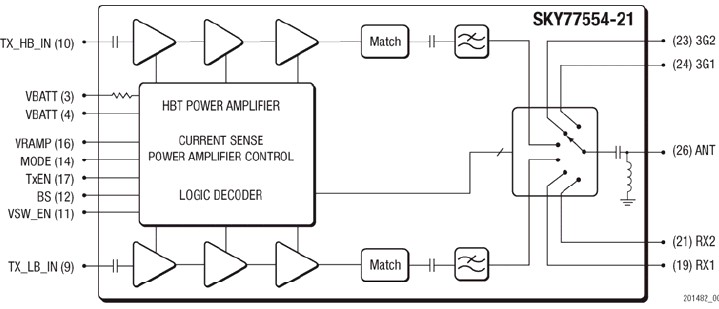 SKY77554-21 is a transmit and receive Front-End Module (FEM) with Integrated Power Amplifier Control (iPAC™) for Dual-band cellular handsets comprising GSM850/900 and DCS1800/PCS1900 operation. Designed in a low profile, compact form factor, the SKY77554-21 offers a complete Transmit VCO-to-Antenna and Antenna-to-Receive SAW filter solution. The FEM also supports Class 12 General Packet Radio Service (GPRS) multi-slot operation. The module consists of a GSM850/900 PA block and a DCS1800/PCS1900 PA block, impedancematching circuitry for 50 ohm input and output impedances, Tx harmonics filtering, high linearity / low insertion loss RF switch, and a Power Amplifier Control (PAC) block with internal current sense resistor. Two Heterojunction Bipolar Transistor (HBT) PA blocks, a BiFET PAC, and switch control circuit are fabricated onto a single Gallium Arsenide (GaAs) die. One PA block supports the GSM850/900 bands and the other PA block supports the DCS1800/PCS1900 bands. Both PA blocks share common power supply pads to distribute current. The output of each PA block and the outputs to the two receive pads are connected to the antenna pad through an RF switch. The GaAs die, Switch die and passive components are mounted on a multi-layer laminate substrate. The assembly is encapsulated with plastic overmold.