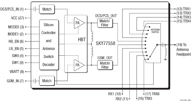 The SKY77558 is a transmit and receive Front End Module (FEM) designed in a very low profile (0.9 mm), compact form factor for quad-band cellular handsets comprising GSM850/900, DCS1800, and PCS1900 operation — a complete transmit VCO-to-Antenna and Antenna-toreceive SAW filter solution. The FEM also supports Class 12 General Packet Radio Service (GPRS) multi-slot operation and EDGE Polar Modulation. WCDMA switch-through support is provided by four dedicated high-linearity ports. The module consists of a GSM850/900 PA and DCS1800/PCS1900 PA block, impedancematching circuitry for 50 Ω input and output impedances, Tx harmonic filtering, high linearitylow insertion loss switches, and a CMOS Power Amplifier Control (PAC) block. A custom silicon integrated circuit contains decoder circuitry to control the RF switch while providing a low current external control interface. An integrated temperature sensor provides an analog voltage based on the temperature of the module. Fabricated in InGaP/GaAs, the Heterojunction Bipolar Transistor (HBT) PA blocks support the GSM850/900 bands and DCS1800/PCS1900 bands. Both PA blocks share common power supply pads to distribute current. The output of the PA block and the outputs to the seven receive pads connect to the antenna pad through a highly linear antenna switch. The WCDMA and Rx ports feature a 0 volts DC offset level, which eliminates any need for external blocking capacitors. The InGaP/GaAs die, switch die, Silicon (Si) controller die, and passive components are mounted on a multi-layer laminate substrate and the entire assembly is encapsulated with plastic overmold.