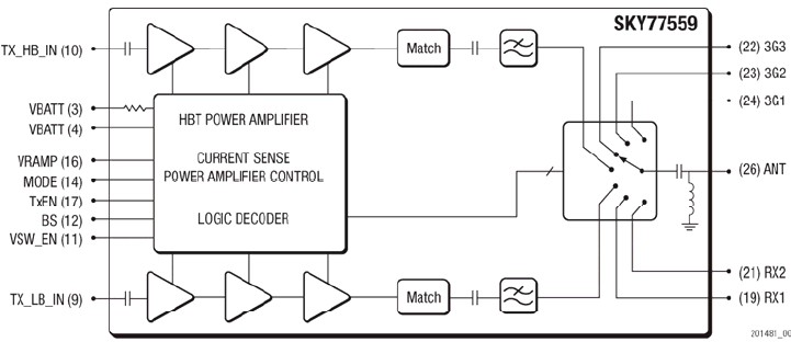 SKY77559 is a transmit and receive Front-End Module (FEM) with Integrated Power Amplifier Control (iPAC™) designed in a low profile, compact form factor for dual-band cellular handsets comprising GSM850/900 and DCS1800/PCS1900 operation. The SKY77559 offers a complete Transmit VCO-to-Antenna and Antenna-to-Receive SAW filter solution. The FEM also supports Class 12 General Packet Radio Service (GPRS) multi-slot operation. The module consists of a GSM850/900 PA block and a DCS1800/PCS1900 PA block, impedancematching circuitry for 50 ohm input and output impedances, Tx harmonics filtering, high linearity / low insertion loss RF switch, and a Power Amplifier Control (PAC) block with internal current sense resistor. Two Heterojunction Bipolar Transistor (HBT) PA blocks, a BiFET PAC, and switch control circuit are fabricated onto a single Gallium Arsenide (GaAs) die. One PA block supports the GSM850/900 bands and the other PA block supports the DCS1800/PCS1900 bands. Both PA blocks share common power supply pads to distribute current. The output of each PA block and the outputs to the two receive pads are connected to the antenna pad through an RF switch. The GaAs die, Switch die and passive components are mounted on a multi-layer laminate substrate. The assembly is encapsulated with plastic overmold.