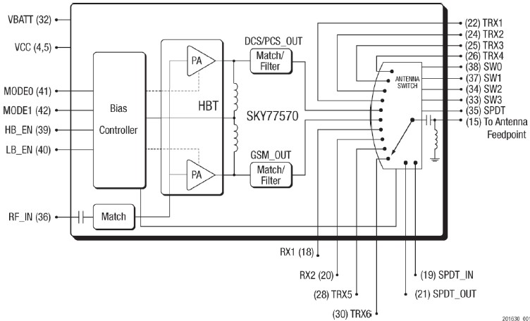 The SKY77570 is a transmit and receive Front End Module (FEM) designed in a very low profile (0.9 mm), compact form factor for quad-band cellular handsets comprising GSM850/900, DCS1800, and PCS1900 operation — a complete transmit VCO-to-Antenna and Antenna-toreceive SAW filter solution. The FEM also supports Class 12 General Packet Radio Service (GPRS) multi-slot operation and EDGE Polar Modulation. WCDMA switch-through support is provided by four dedicated high-linearity ports. The module consists of a GSM850/900 PA and DCS1800/PCS1900 PA block, impedancematching circuitry for 50 Ω input and output impedances, Tx harmonic filtering, high linearitylow insertion loss switches, and a CMOS Power Amplifier Control (PAC) block. A custom silicon integrated circuit contains decoder circuitry to control the RF switch while providing a low current external control interface. An integrated temperature sensor provides an analog voltage based on the temperature of the module. Fabricated in InGaP/GaAs, the Heterojunction Bipolar Transistor (HBT) PA blocks support the GSM850/900 bands and DCS1800/PCS1900 bands. Both PA blocks share common power supply pads to distribute current. The output of the PA block and the outputs to the seven receive pads connect to the antenna pad through a highly linear antenna switch. The WCDMA and Rx ports feature a 0 volts DC offset level, which eliminates any need for external blocking capacitors. The InGaP/GaAs die, switch die, Silicon (Si) controller die, and passive components are mounted on a multi-layer laminate substrate and the entire assembly is encapsulated with plastic overmold.
