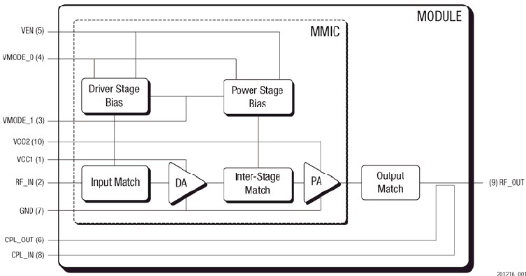 The SKY77701 Power Amplifier Module (PAM) is a fully matched 10-pad surface mount module developed for Wideband Code Division Multiple Access (WCDMA) applications. This small and efficient module packs full 1920–1980 MHz bandwidth coverage into a single compact package. Because of high efficiencies attained throughout the entire power range, the SKY77701 delivers unsurpassed talk-time advantages. The SKY77701 meets the stringent spectral linearity requirements of High Speed Downlink Packet Access (HSDPA), High Speed Uplink Packet Access (HSUPA), and Long Term Evolution (LTE) data transmission with high power added efficiency. A directional coupler is integrated into the module thus eliminating the need for any external coupler. The single Gallium Arsenide (GaAs) Microwave Monolithic Integrated Circuit (MMIC) contains all active circuitry in the module. The MMIC contains on-board bias circuitry, as well as input and interstage matching circuits. Output match into a 50-ohm load is realized off-chip within the module package to optimize efficiency and power performance. The SKY77701 PAM is manufactured with SKYWORKS’ InGaP GaAs Heterojunction Bipolar Transistor (HBT) BiFET process that provides for all positive voltage DC supply operation while maintaining high efficiency and good linearity. Primary bias to the SKY77701 is supplied directly from any three-cell Ni-Cd, a single-cell Li-Ion, or other suitable battery with an output in the 3.2 to 4.2 volt range. No VREF voltage is required. Power down is accomplished by setting the voltage on VENABLE to zero volts. No external supply side switch is needed as typical “off” leakage is a few microamperes with full primary voltage supplied from the battery.