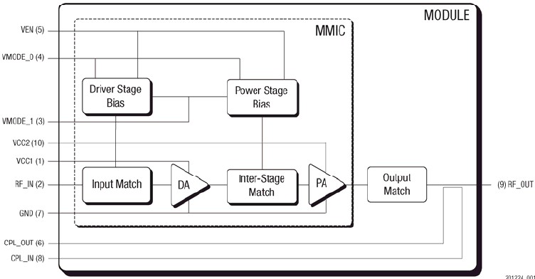 The SKY77705 Power Amplifier Module (PAM) is a fully matched 10-pad surface mount module developed for Wideband Code Division Multiple Access (WCDMA) applications. This small and efficient module packs full 880–915 MHz bandwidth coverage into a single compact package. Because of high efficiencies attained throughout the entire power range, the SKY77705 delivers unsurpassed talk-time advantages. The SKY77705 meets the stringent spectral linearity requirements of High Speed Downlink Packet Access (HSDPA), High Speed Uplink Packet Access (HSUPA), and Long Term Evolution (LTE) data transmission with high power added efficiency. A directional coupler is integrated into the module thus eliminating the need for any external coupler. The single Gallium Arsenide (GaAs) Microwave Monolithic Integrated Circuit (MMIC) contains all active circuitry in the module. The MMIC contains on-board bias circuitry, as well as input and interstage matching circuits. Output match into a 50-ohm load is realized off-chip within the module package to optimize efficiency and power performance. The SKY77705 PAM is manufactured with SKYWORKS’ InGaP GaAs Heterojunction Bipolar Transistor (HBT) BiFET process that provides for all positive voltage DC supply operation while maintaining high efficiency and good linearity. Primary bias to the SKY77705 is supplied directly from any three-cell Ni-Cd, a single-cell Li-Ion, or other suitable battery with an output in the 3.2 to 4.2 volt range. No VREF voltage is required. Power down is accomplished by setting the voltage on VENABLE to zero volts. No external supply side switch is needed as typical “off” leakage is a few microamperes with full primary voltage supplied from the battery.