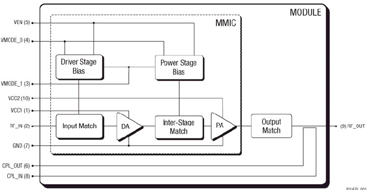 The SKY77711 Power Amplifier Module (PAM) is a fully matched 10-pad surface mount module developed for Code Division Multiple Access (CDMA) applications. This small and efficient module packs full coverage of bandwidth for 1850–1910 MHz into a single compact package. Because of high efficiencies attained throughout the entire power range, the SKY77711 delivers unsurpassed talk-time advantages. A directional coupler is integrated into the module thus eliminating the need for any external coupler. The single Gallium Arsenide (GaAs) Microwave Monolithic Integrated Circuit (MMIC) contains all active circuitry in the module. The MMIC contains on-board bias circuitry, as well as input and interstage matching circuits. Output match into a 50-ohm load is realized off-chip within the module package to optimize efficiency and power performance. The SKY77711 PAM is manufactured with SKYWORKS’ InGaP GaAs Heterojunction Bipolar Transistor (HBT) BiFET process that provides for all positive voltage DC supply operation while maintaining high efficiency and good linearity. Primary bias to the SKY77711 is supplied directly from any suitable battery with an output in the 3.2 to 4.2 volt range. No VREF voltage is required. Power down is accomplished by setting the voltage on VENABLE to zero volts. No external supply side switch is needed as typical “off” leakage is a few microamperes with full primary voltage supplied from the battery.