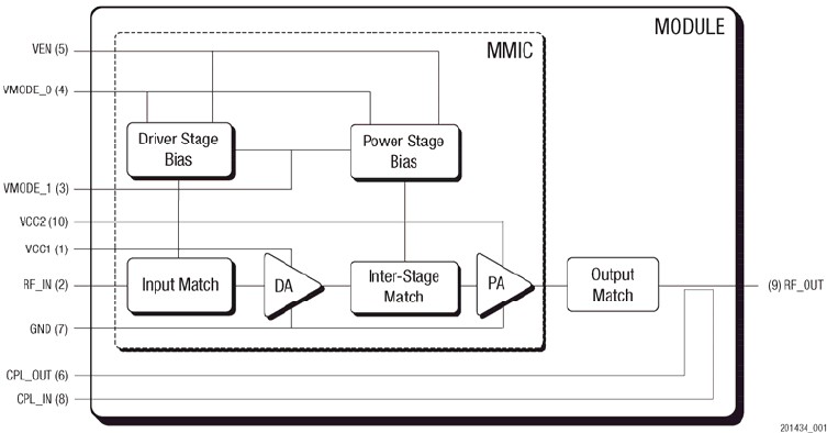 The SKY77732 Power Amplifier Module (PAM) is a fully matched 10-pad surface mount module developed for Code Division Multiple Access (CDMA) applications. This small and efficient module packs full coverage of bandwidth for 1850–1910 MHz into a single compact package. Because of high efficiencies attained throughout the entire power range, the SKY77732 delivers unsurpassed talk-time advantages. A directional coupler is integrated into the module thus eliminating the need for any external coupler. The single Gallium Arsenide (GaAs) Microwave Monolithic Integrated Circuit (MMIC) contains all active circuitry in the module. The MMIC contains on-board bias circuitry, as well as input and interstage matching circuits. Output match into a 50-ohm load is realized off-chip within the module package to optimize efficiency and power performance. The SKY77732 PAM is manufactured with SKYWORKS’ InGaP GaAs Heterojunction Bipolar Transistor (HBT) BiFET process that provides for all positive voltage DC supply operation while maintaining high efficiency and good linearity. Primary bias to the SKY77732 is supplied directly from any suitable battery with an output in the 3.2 to 4.2 volt range. No VREF voltage is required. Power down is accomplished by setting the voltage on VENABLE to zero volts. No external supply side switch is needed as typical “off” leakage is a few microamperes with full primary voltage supplied from the battery.