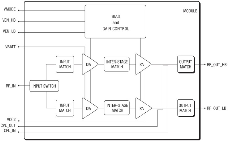 The SKY77745 Power Amplifier Module (PAM) is a fully matched, 14-pad, surface mount module developed for Wideband Code Division Multiple Access (WCDMA) applications. This small and efficient module packs full WCDMA Band I and Band V coverage into a single compact package. The SKY77745 meets the stringent spectral linearity requirements of WCDMA transmission, with high power added efficiency for power output to 28.25 dBm (Band I and Band V). The SKY77745 meets the stringent spectral linearity requirements of High Speed Downlink Packet Access (HSDPA) data transmission with high power added efficiency. A directional coupler is integrated into the module thus eliminating the need for any external coupler. The single Gallium Arsenide (GaAs) Microwave Monolithic Integrated Circuit (MMIC) contains all active circuitry in the module. The MMIC contains on-board bias circuitry, as well as input and interstage matching circuits. Output match into a 50-ohm load is realized off-chip within the module package to optimize efficiency and power performance. The SKY77745 PAM is manufactured with SKYWORKS’ InGaP GaAs Heterojunction Bipolar Transistor (HBT) BiFET process that provides for all positive voltage DC supply operation while maintaining high efficiency and good linearity. No VREF voltage is required. Power down is accomplished by setting the voltage on VENABLE to zero volts. No external supply side switch is needed as typical “off” leakage is a few microamperes with full primary voltage supplied from the battery.
