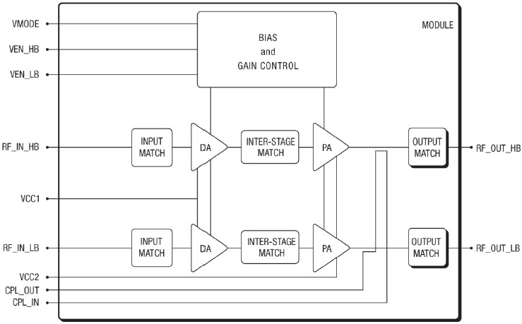 The SKY77751 Power Amplifier Module (PAM) is a fully matched, 14-pad, surface mount module developed for Wideband Code Division Multiple Access (WCDMA) applications. This small and efficient module packs full WCDMA Band I and Band VIII coverage into a single compact package. The SKY77751 meets the stringent spectral linearity requirements of WCDMA transmission, with high power added efficiency for power output to 27.5 dBm (Band I) and 28 dBm (Band VIII). The SKY77751 meets the stringent spectral linearity requirements of High Speed Downlink Packet Access (HSDPA) data transmission with high power added efficiency. A directional coupler is integrated into the module thus eliminating the need for any external coupler. The single Gallium Arsenide (GaAs) Microwave Monolithic Integrated Circuit (MMIC) contains all active circuitry in the module. The MMIC contains on-board bias circuitry, as well as input and interstage matching circuits. Output match into a 50-ohm load is realized off-chip within the module package to optimize efficiency and power performance. The SKY77751 PAM is manufactured with SKYWORKS’ InGaP GaAs Heterojunction Bipolar Transistor (HBT) BiFET process that provides for all positive voltage DC supply operation while maintaining high efficiency and good linearity. No VREF voltage is required. Power down is accomplished by setting the voltage on VENABLE to zero volts. No external supply side switch is needed as typical “off” leakage is a few microamperes with full primary voltage supplied from the battery.