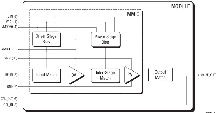 The SKY77761-11 Power Amplifier Module (PAM) is a fully matched 10-pad surface mount module developed for Wideband Code Division Multiple Access (WCDMA) applications. This small and efficient module packs full 1920–1980 MHz bandwidth coverage into a single compact package. Because of high efficiencies attained throughout the entire power range, the SKY77761-11 delivers unsurpassed talk-time advantages. The SKY77761-11 meets the stringent spectral linearity requirements of High Speed Downlink Packet Access (HSDPA), and High Speed Uplink Packet Access (HSUPA) data transmission with high power added efficiency. An integrated directional coupler eliminates the need for any external coupler. The Gallium Arsenide (GaAs) Microwave Monolithic Integrated Circuit (MMIC) contains all amplifier active circuitry, including input and interstage matching circuits. The silicon CMOS support die, providing precision biasing for the MMIC affords a true CMOS-compatible control interface. Output match into a 50-ohm load, realized off-chip within the module package, optimizes efficiency and power performance. The SKY77761-11 is manufactured with SKYWORKS’ InGaP GaAs Heterojunction Bipolar Transistor (HBT) process which provides for all positive voltage DC supply operation and maintains high efficiency and good linearity. While primary bias to the SKY77761-11 can be supplied directly from any suitable battery with an output of 3.2 V to 4.2 V, optimal performance is obtained with VCC2 sourced from a DC-DC power supply adjusted within 0.5 V to 3.6 V based on target output power levels. Power down executes by setting VENABLE to zero volts. No external supply side switch is needed as typical “off” leakage is 1 μA with full primary voltage supplied from the battery.