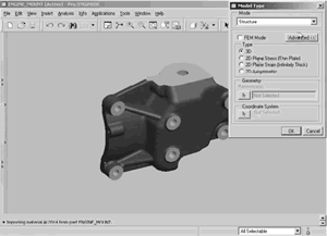 让我们先来看看最新的pro/engineer wildfire野火版2.0版中的模拟模块在外观和功能上的一些改变:最引人注目的首先是模拟用户界面的改进,指定模型类型这一典型的先期任务现已移到了一个对话框中,使此操作比以前版本更简单(如图1所示);其次,pro/engineer wildfire野火版2.0中的菜单管理器也脱离了用户界面,这意味着pro/engineer 窗口可占用整个桌面,使命令访问变得更直接、更简单(如图2所示);另外,在选取功能方面的改进包括选取对象操作参照以及选取操作的简化,用户可以方便的创建约束条件(如图3所示);最后,如果用户想更改工作模式,例如切换到 fem 模式,只需编辑模型类型即可(如图4所示)。
