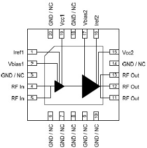 The TriQuint AH314-G is a high dynamic range broadband driver amplifier in a surface mount package. The two-stage amplifier has 23 dB of gain, while achieving +25dBm of linear output power for 2.3 to 2.9 GHz applications. The AH314-G uses a high reliability +5V InGaP / GaAs HBT process technology. The device incorporates proprietary bias circuitry to compensate for variations in linearity and current draw over temperature. An internal active bias allows the AH314-G to operate directly off a commonly available +5V supply. The RoHS-compliant / lead-free 5x5mm QFN package is surface mountable to allow for low manufacturing costs to the end user. The AH314-G is also package and pin compatible with the 3.3 - 3.8 GHz AH315-G and the 0.7 - 2.7 GHz AH323-G. The AH314-G is targeted for use in a configuration for the driver stage amplifier in next generation base stations where high linearity and medium power is required.
