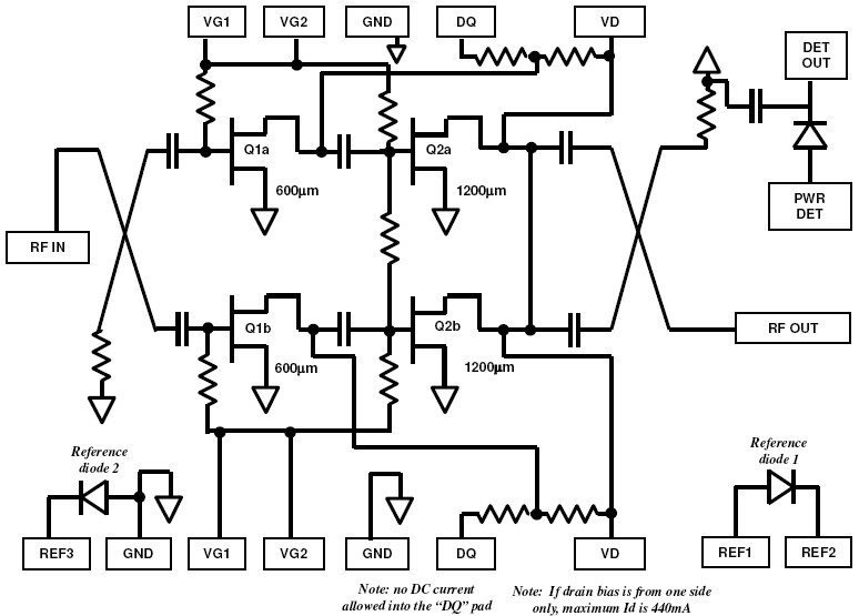 The TriQuint TGA1135B-SCC is a three stage MPA MMIC design using TriQuint’s proven 0.25 um Power pHEMT process. The TGA1135B-SCC is designed to support a variety of millimeter wave applications including point-to-point digital radio and point-to-multipoint communications. The three stage design consists of a 200 um input device driving a 480um interstage device followed by an 800um output device. The TGA1135B-SCC provides 25dBm nominal output power at 1dB compression across 19-27GHz. Typical small signal gain is 22 dB. The TGA1135B-SCC requires minimum off-chip components. Each device is 100% DC and RF tested on-wafer to ensure performance compliance. The device is available in chip form.