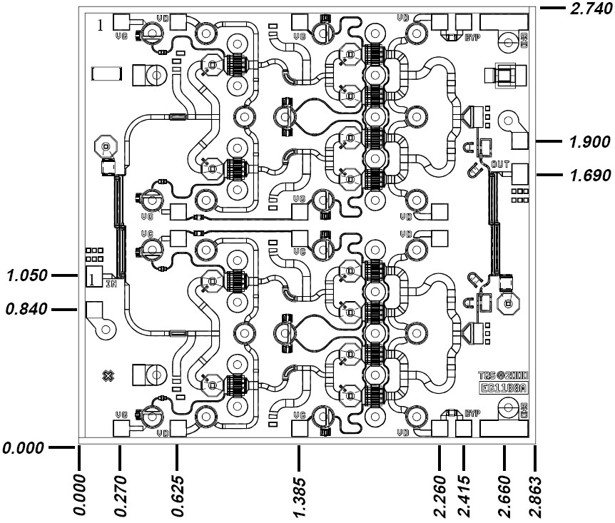 The TriQuint TGA1171-SCC is a two-stage PA MMIC design using TriQuint's proven 0.25 mm power pHEMT process to support a variety of millimeter wave applications including point-to-point digital radio and point-to-multipoint systems. The balanced design consists of four 400 um input devices driving eight 400 um output devices. The TGA1171-SCC provides 29 dBm of output power at 1 dB gain compression and greater than 30 dBm saturated output power across 36 - 40 GHz with a typical small signal gain of 14 dB. Typical input / output return loss is typically greater than 12-15 dB across the band. The TGA1171-SCC requires minimal off-chip components. Each device is 100% DC and RF tested on-wafer to ensure performance compliance. The device is available in chip form.