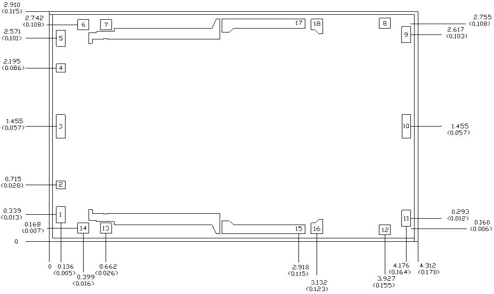 - Chip dimensions: 4.3 x 2.9 x 0.1 mm (170 x 115 x 4 mils)