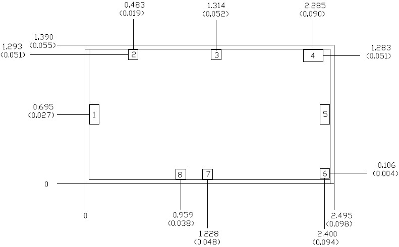 - Chip dimensions: 2.5 x 1.4 x 0.1 mm (98 x 55 x 4 mils)
