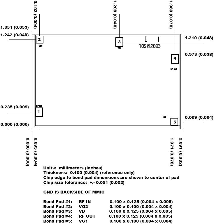 The TriQuint TGA2513 is a compact low noise amplifier (LNA) / gain block MMIC. The LNA operates from 2 - 23 GHz and is designed using TriQuint's proven standard 0.15 um gate pHEMT production process. The TGA2513 provides a nominal 16 dBm of output power at 1 dB gain compression with a small signal gain of 17 dB. Typical noise figure is less than 3 dB from 2 - 18 GHz. The TGA2513 is suitable for a variety of wideband electronic warfare (EW) systems such as radar warning receivers, electronic counter measures, decoys, jammers and phased array systems. The TGA2513 is 100% DC and RF tested on-wafer to ensure performance compliance. The part is lead-free and RoHS compliant. Evaluation boards are available upon request.