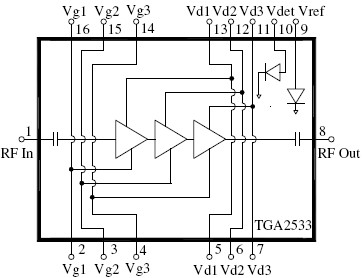 The TriQuint TGA2533 is a Ku band power amplifier. The TGA2533 operates from 12.7 to 15.4 GHz and is designed using TriQuint's power pHEMT production process. The TGA2533 typically provides 43 dBm of TOI at 20 dBm Pout/Tone, 34 dBm of output power at 1 dB gain compression and small signal gain of 28 dB. The TGA2533 is ideally suited for point-to-point radio and Ku band VSAT ground terminals. The part is lead-free and RoHS compliant.