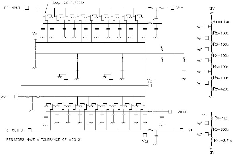 The TriQuint TGA8344-SCC features two cascaded monolithic low-noise distributed amplifiers with on-chip bias operating from 2 to 18 GHz. This die offers the advantage of high gain, typically 19 dB, in compact die size with simplified biasing configuration. Noise figure is typically 4 dB. The two cascade amplifiers have eighteen 122 um gate-width FETs providing 16 dBm of output power at 1 dB gain compression. Input return loss is typically 14 dB from 2 to 18 GHz and output return loss is typically 13 dB. Ground is provided to the circuitry through vias to the backside metallization. The part's small size and high gain make it suitable for use in a variety of wide-band electronic commercial and warfare systems. Bond pad and backside metallization is gold plated for compatibility with eutectic alloy attachment methods as well as the thermocompression wire bonding processes. The TGA8344-SCC is supplied in chip form and is readily assembled using automated equipment.
