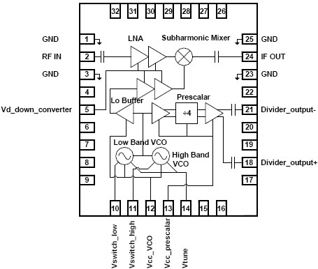 The TriQuint TGC4408-SM is a low cost Ku band downconverter. It provides in a single package a dual band VCO, a subharmonic mixer and all the associated gain stages required to integrate the VCO and the mixer. The TGC4408-SM provides a differential signal at 1/4th the VCO frequency for use in a phase-locked loop. The subharmonic mixer is manufactured using TriQuint's pHEMT process; the VCO and the prescaler are manufactured using TriQuint's HBT process. The TGC4408-SM is available as a single surface mount 32 lead 5x6 QFN package and is ideally suited for VSAT ground terminals and millimeter wave communication receivers. Lead-free and RoHS compliant. Evaluation Boards are available upon request.